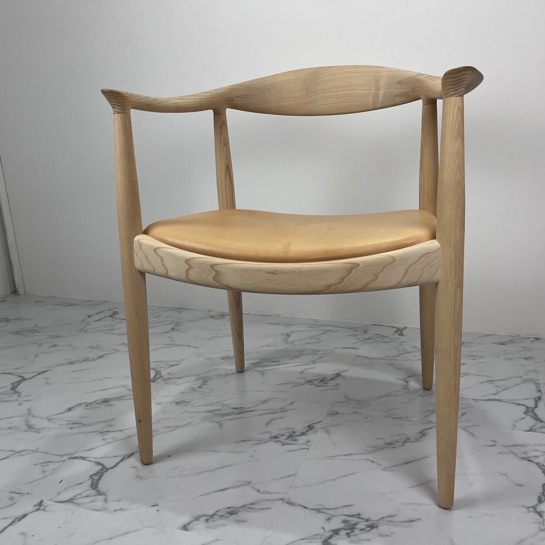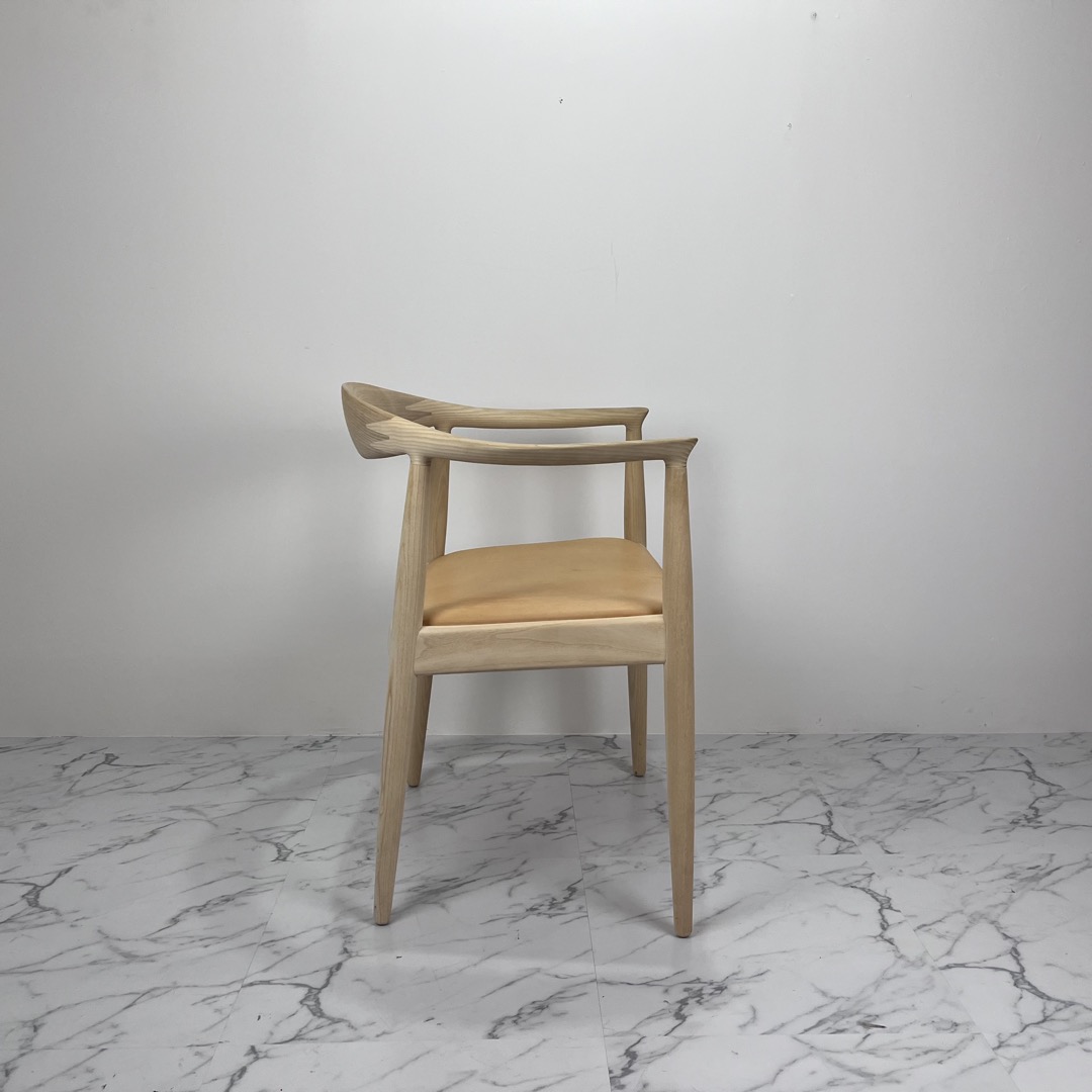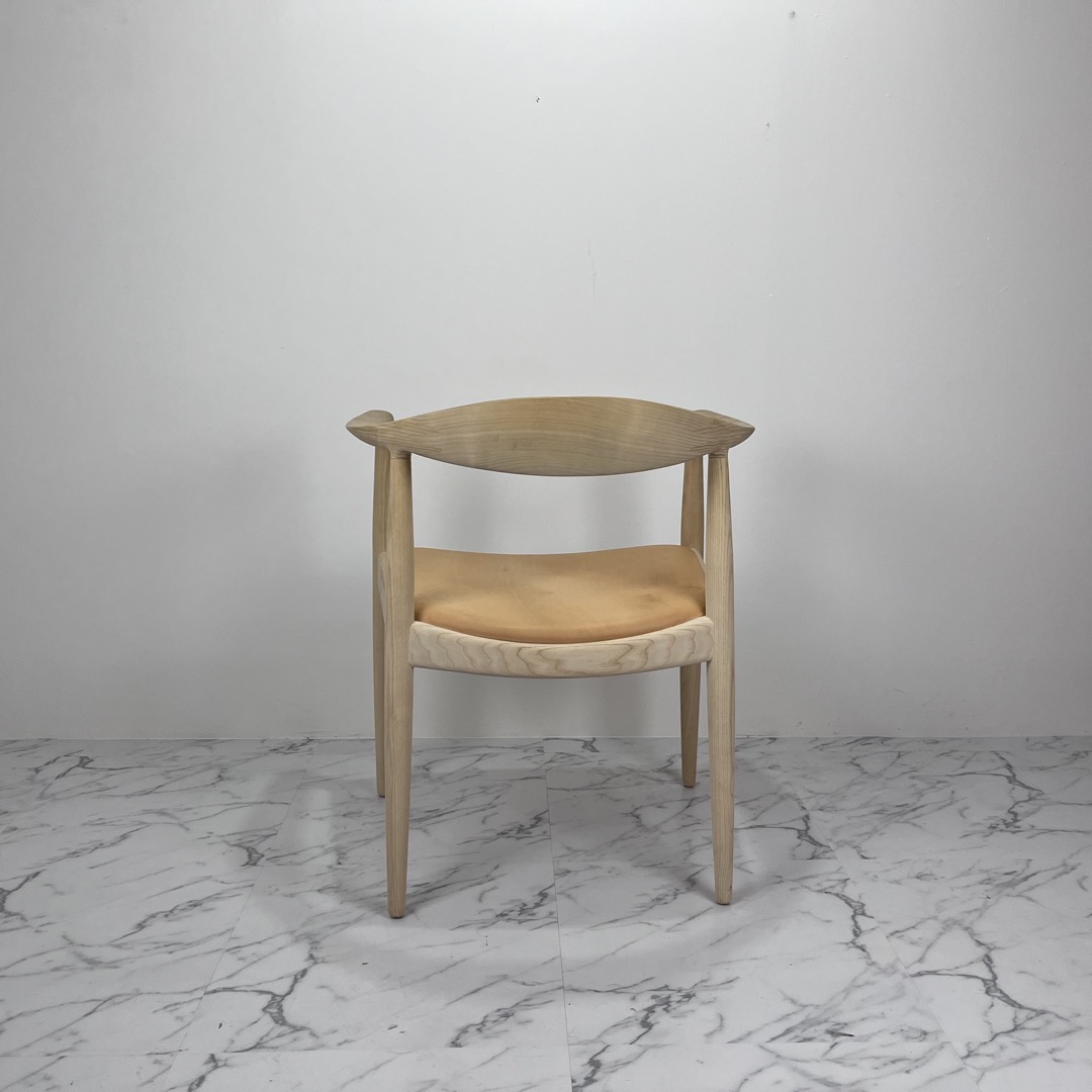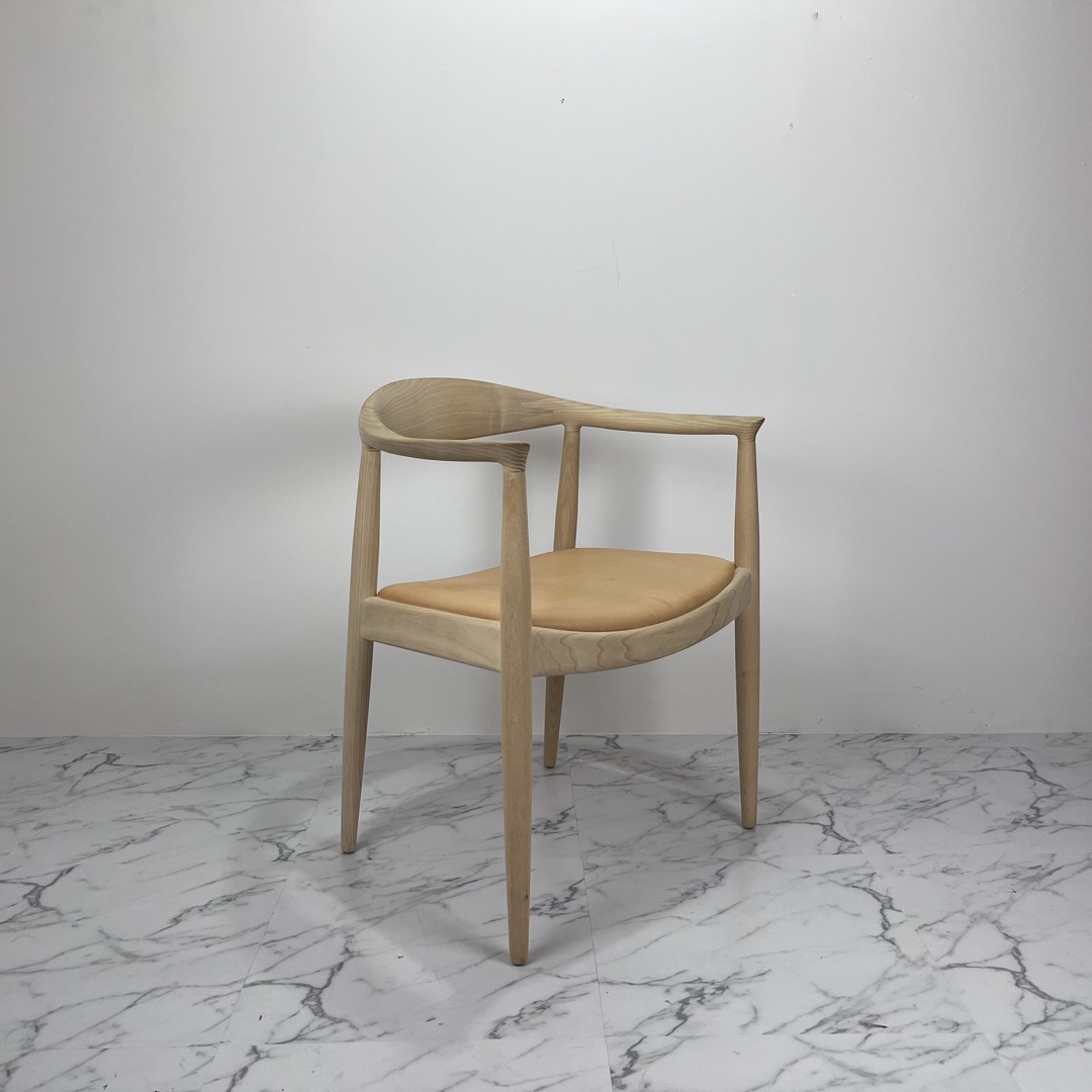 ウェグナー自身が慣例的に用いた、地方特有の謙虚さを表現した“ラウンドワン”(ザ・チェア)は、デンマーク家具の中でも最も著名な作品の1つであるだけでなく、間違いなく最もデンマークらしさを体現しています。その控えめでシンプルな佇まいは、伝統的なデンマークの木工技術とデザイン哲学の本質を見事に凝縮しており、ハンス J. ウェグナーの最高傑作とさえ称されています。