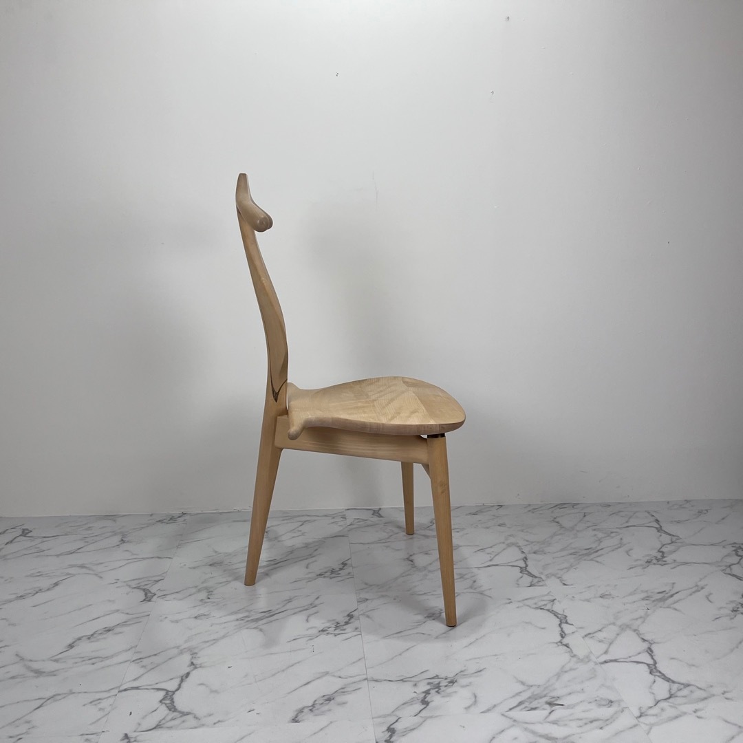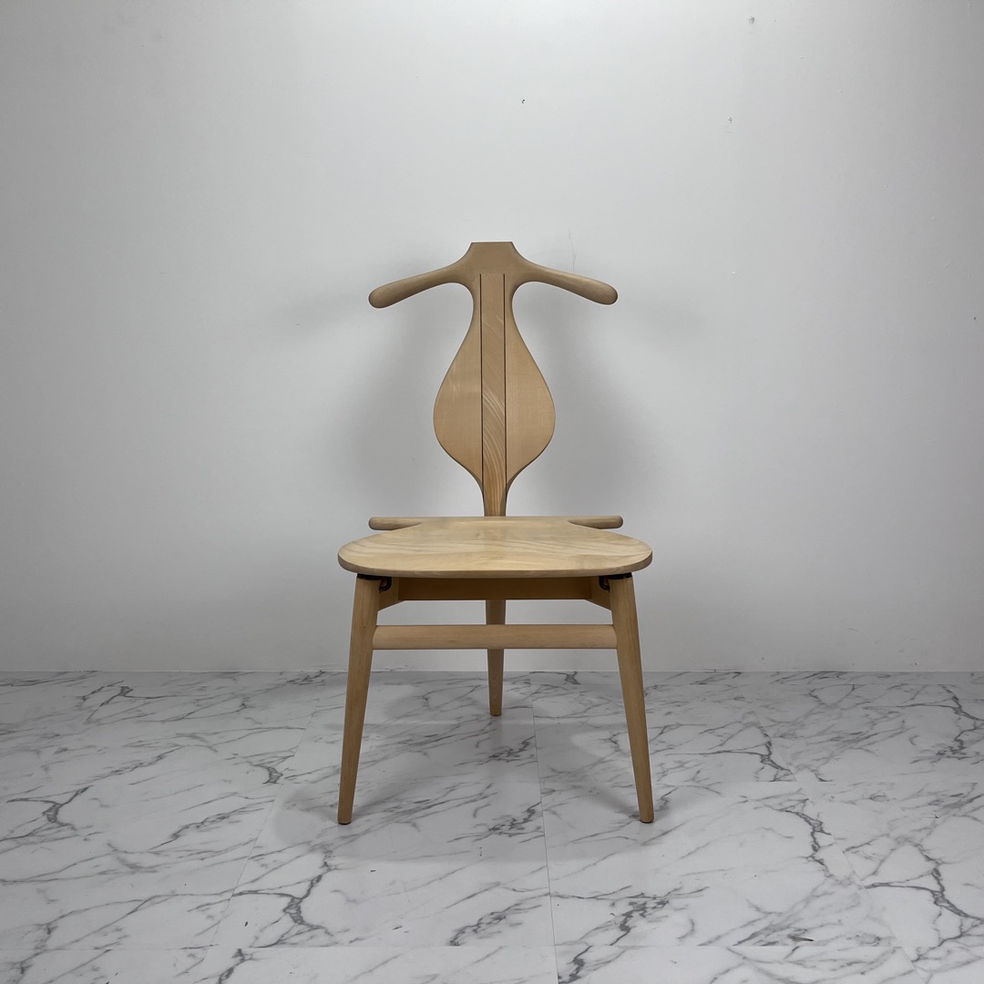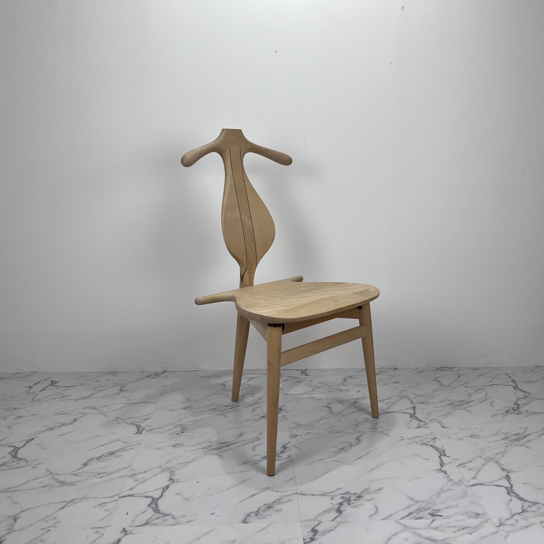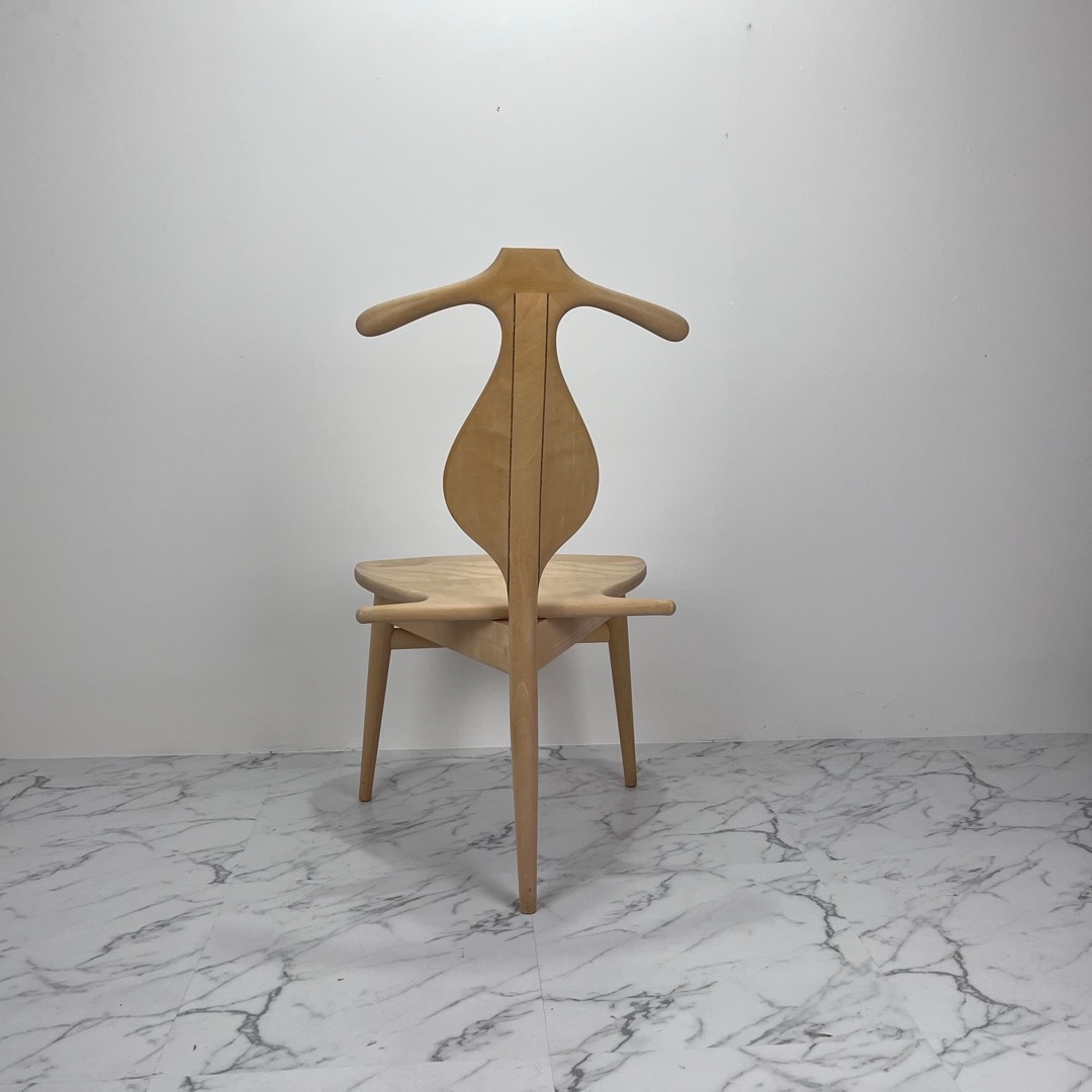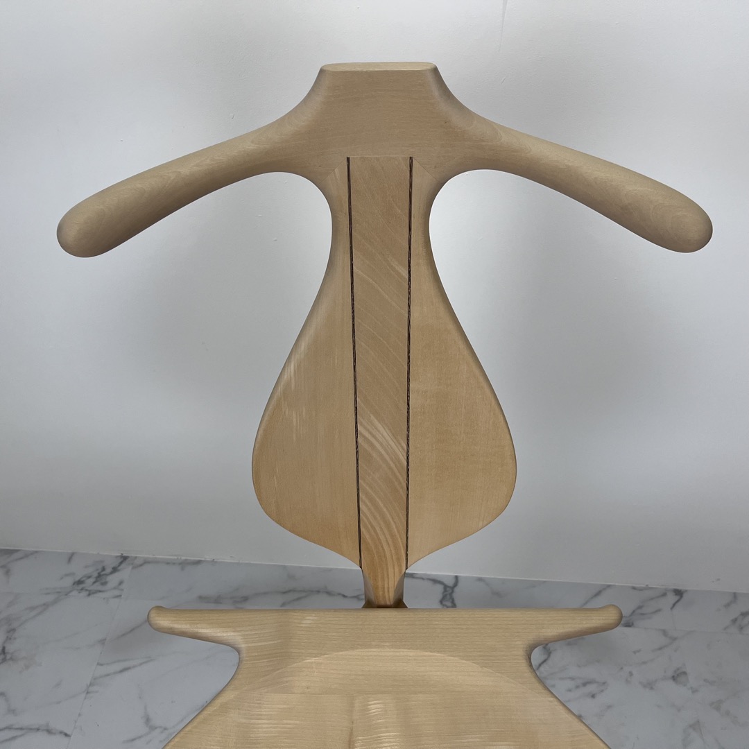 ヴァレットチェアは、伝統的なヴァレットスタンドの機能を精巧に作られた木製椅子に適用した、機能的な彫刻作品です。背もたれは、快適な背もたれとジャケットやコートを掛けるための適切なハンガーの両方の役割を果たすように形作られています。