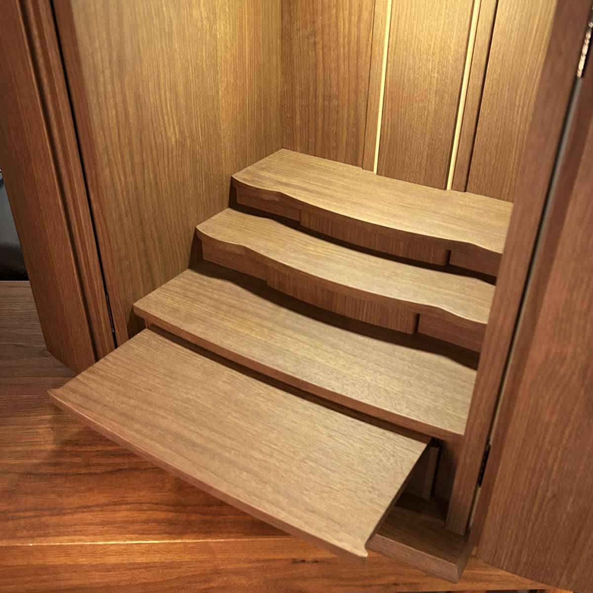 仏壇全体に渡り細部に線を使うことで、上置き仏壇でも荘厳な雰囲気を保つ。広々スペースが特徴のコンパクトサイズ。ウォールナットインテリアに沿ったスタイルにぴったり。扉と御本尊後ろの板に市松柄を使用することで、従来の仏壇のイメージとは全く異なるインテリアとしての仏壇へと変わりました。場所をとりがちなお花や写真を仏壇の両脇にお供えすることで、広々とした中の空間が生まれます。またお花と写真の後ろ側は扉が屏風代わりに、下側の敷板はお座布団代わりとなり、そこまでのスペースが仏壇の中にあると捉えることができます。省エネ・長寿命のLED照明付きです。