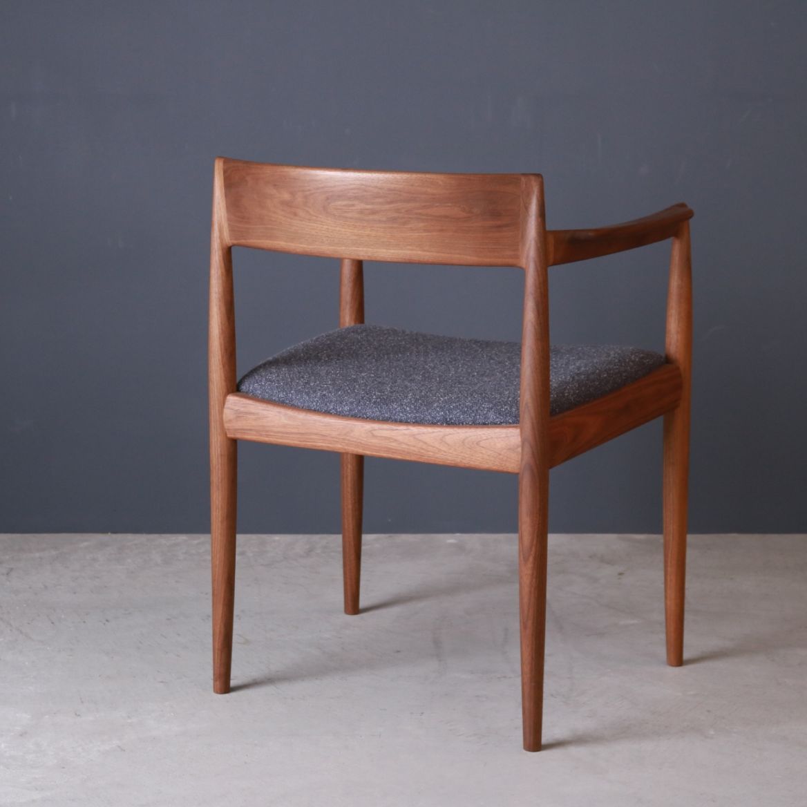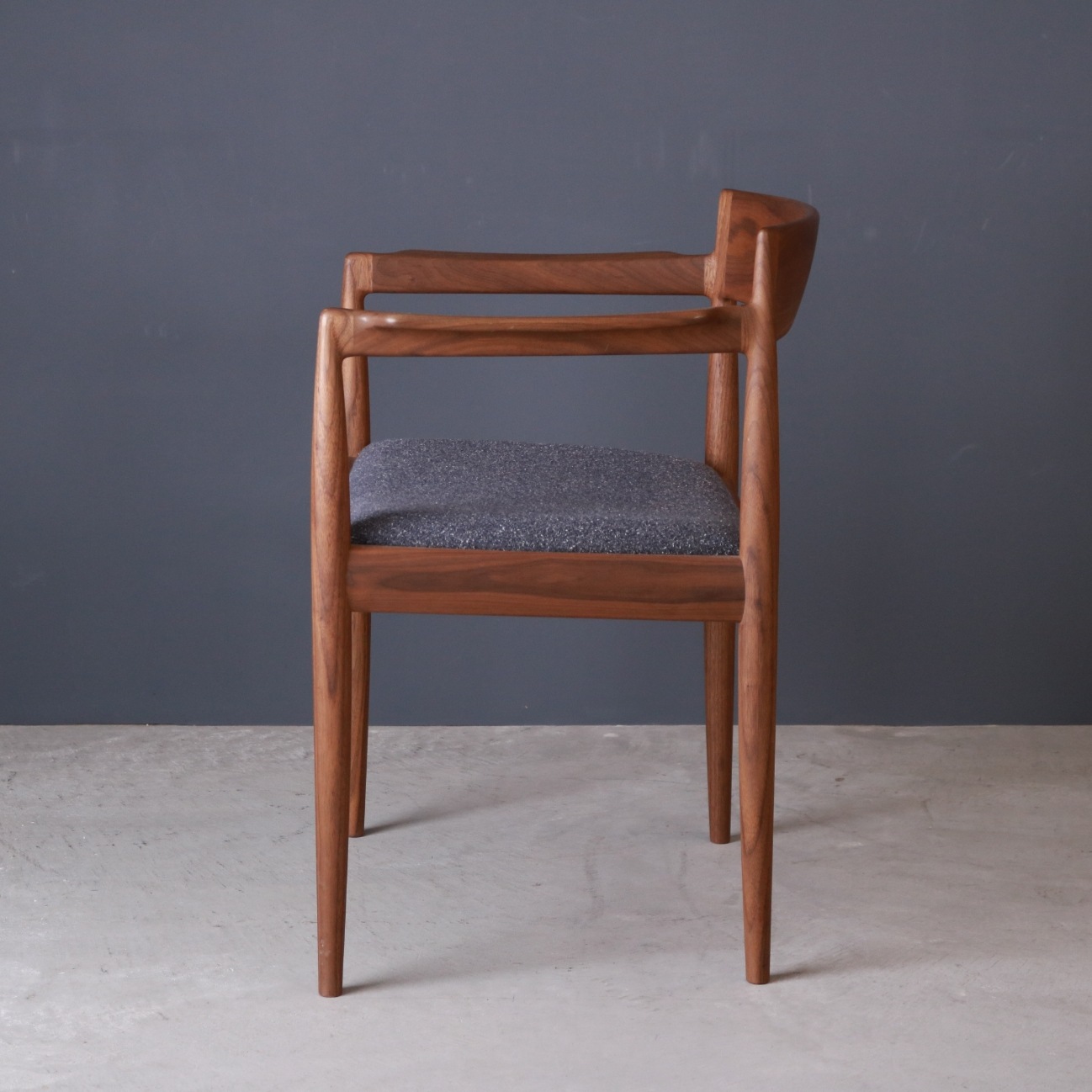 背からアームにかけての曲線が非常に滑らかで、まるで体をやさしく抱きしめるようなフィット感が心地いい。宮崎椅子製作所が得意とする「無垢材の三次元削り出し」による立体的な曲面が、肩・腕・背中を自然に支えます。長時間の食事や談話でも疲れにくく、「座ることが楽しくなる椅子」として評価されています。